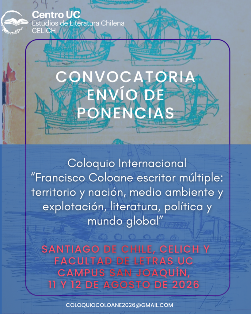 Coloquio Internacional “Francisco Coloane escritor múltiple: territorio y nación, medio ambiente y explotación, literatura, política y mundo global” Santiago de Chile, CELICH y Facultad de Letras UC, Campus San Joaquín, 11 y 12 de agosto de 2026 “Viento y nieve, mar y tierra entre los canales patagónicos, en las rutas de Magallanes y la Antártida”, son, […]