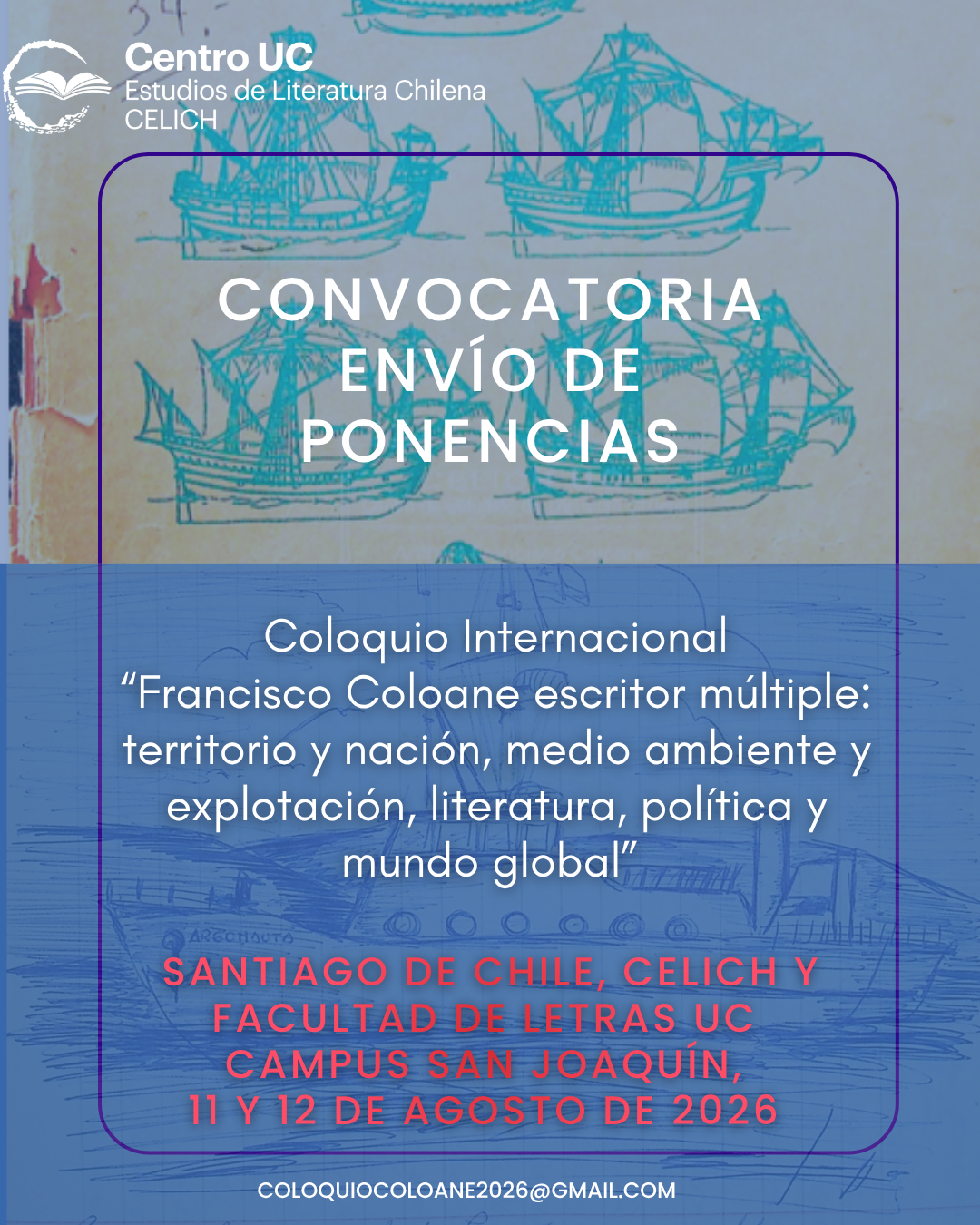 Coloquio Internacional “Francisco Coloane escritor múltiple: territorio y nación, medio ambiente y explotación, literatura, política y mundo global” Santiago de Chile, CELICH y Facultad de Letras UC, Campus San Joaquín, 11 y 12 de agosto de 2026 “Viento y nieve, mar y tierra entre los canales patagónicos, en las rutas de Magallanes y la Antártida”, son, […]